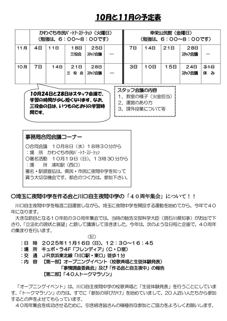- 10月22日2022年埼玉に夜間中学を作る会・川口自主夜間中学『37周年集会』